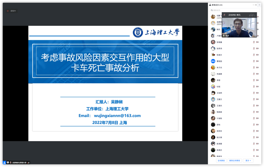 交通系统工程系王嘉文、吴静娴两位青年教师代表从各自研究领域出发,为参营的同学们做了研究成果的学术讲座。王嘉文副教授从当下热门的交通研究话题切入,就“互联网+数据驱动的城市道路交通管理优化”的研究背景、现有成果,以及未来的发展前景,做了较为生动的学术报告。吴静娴老师通过聚焦其研究课题“考虑事故风险因素交互作用的大型卡车死亡事故分析”,给同学们报告了一个研究课题从问题的提出、解决问题的理论和方法、研究结论验证等完整严谨的学术研究思路。最后韩印教授也对两位老师的研究领域、研究课题的进展与成效进行了评述,并积极引导同学们要充分发挥自己的聪明才智。本次开营仪式也在与会老师和同学们的热切讨论中成功落下帷幕。