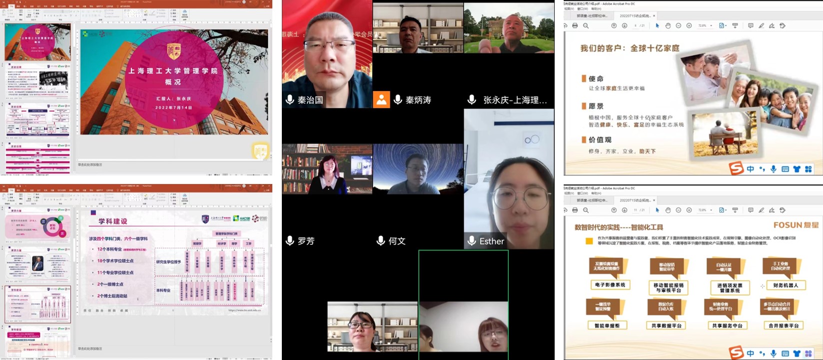 7月15日,管理学院与复星财务共享服务中心举行线上对接交流会。复星财务共享服务中心人力资源资深总监、CHO张扬,人力资源高级经理周慧,财务审核专员、管理学院2020届校友彭玉婷,管理学院副院长张永庆,国际经济与贸易系主任罗芳、副主任秦炳涛、党支部书记何文,学生工作办公室主任秦治国,2023届毕业班年级组长姜晓宁出席本次会议。会议由罗芳教授主持。