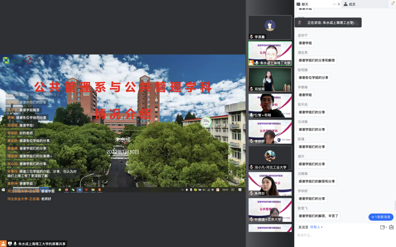 7月30日至31日,上海理工大学公共管理系主办的第一届公共管理学科优秀大学生夏令营通过线上的形式顺利开展。本次夏令营共有来自78所高校的90名学生提交了申请,确定参加夏令营第一天活动的有来自64所高校的70位同学,最终40位报名者入选面试。