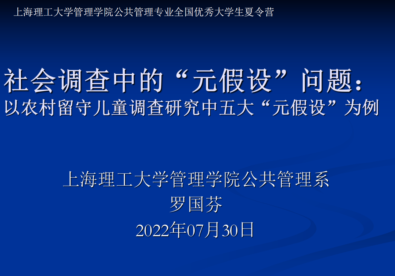 罗国芬副教授以针对农村留守儿童的社会调查为例,介绍了调查研究中的“元假设”基本概念,并从留守儿童分布、对照组设置、“缺陷型”家庭结构、“非留守儿童”家庭祖辈作用以及“农村留守儿童”家庭祖辈作用五大方面分析了当前针对农村留守儿童的社会调查所存在的“元假设”问题。最后,罗老师与营员从如何提升“元假设”思维等内容进行互动。
