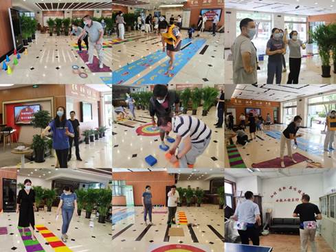 庆祝活动兼具活动性和趣味性,通过游戏让大家在繁忙的工作中能够锻炼身体、放松身心。游戏名称设置也契合学院发展特色。学院设置了“双一流”赛道,由两名参加人员同时进行,一争高下。每名参加人员顺利通过“践行专报”(摸石头过河游戏)、“携手并进”(手脚并用游戏)、“项目百投百中”(套圈游戏)、“小步快跑”(快速通过指压板游戏)、“一击中标”(投掷飞镖游戏)、“桃李满天下”(抖球游戏)六个游戏,即可获得抽奖资格。