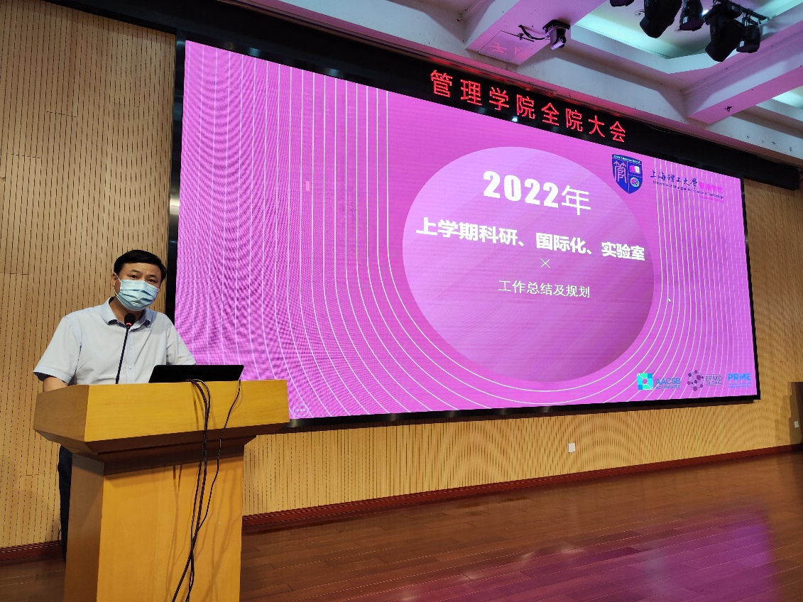 院长赵来军以“戮力同心抗疫情,小步快跑谱新篇”为主题从学院抗疫工作、师资队伍建设、学科学位点建设、专业学位教育中心和EDP中心工作四个方面进行了总结部署。首先,他回顾了上学期带领学院住校教师克服重重困难完成学校抗疫工作,希望大家能够争分夺秒把因疫情耽误的工作尽快赶上。其次,他介绍了今年人才引进的情况,虽然今年已入职教师国际化比例不断提升,但是入职率相比去年同期下降很多,疫情对人才引进工作的影响非常明显。除了学院要加大面试频次,加强宣传力度,他也希望每位教师能够积极荐才引才,只有更多的人才,学院才能有更多的高水平成果产出,才能更快得成为国际一流精英商学院。