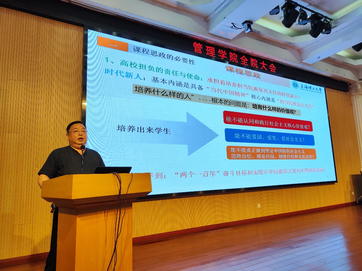 首先,会议邀请了工商管理系主任葛玉辉教授作课程思政示范交流。葛玉辉从高校担负的责任与使命、新时代95后00后大学生特征、课程思政的发展过程三个方面阐述了课程思政的必要性。并通过《人力资源管理》这门课程的体会和做法,与大家分享了课程思政创新模式、方法路径与具体举措。他还提到高校担负着培养担当民族复兴大任的时代新人的责任与使命,在教学过程中要以教为引导,立德树人为本;以科研为支撑,教学促进科研,科研反哺教学;以创为提升,实现教学方法创新和学生双创能力提升同向聚合;以质为落脚,呼应培养目标。