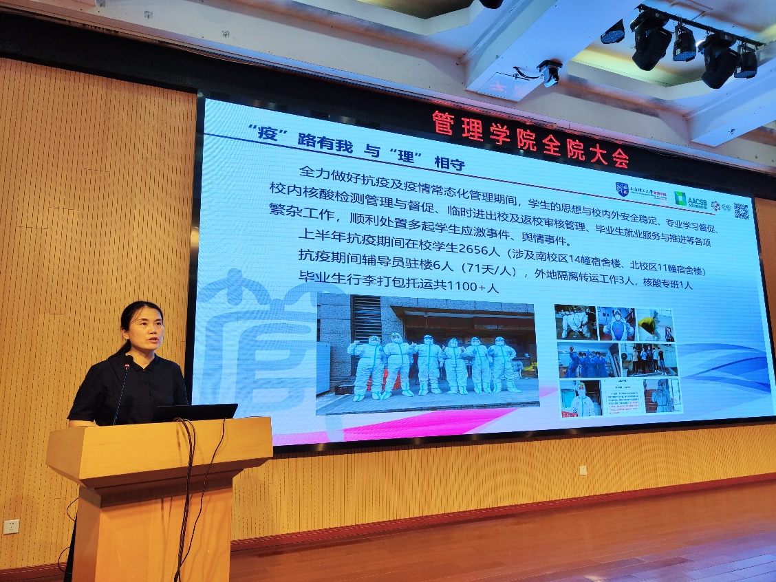 院党委副书记蒲莹莹从学生活动开展、今年就业工作推进等方面对疫情常态化管理期间的学生工作进行了总结部署。她指出,一方面管理学院在校生体量大,疫情常态化形势下日常管理压力重重。我们要转变工作思路,探索和完善线上学生管理与服务、学生活动开展新模式。另一方面,毕业生线上求职、面试能力亟待提升,择业观念需要转变提升。学院应尽早启动明年的就业工作,汇聚各方力量全力做好2023届就业工作。
