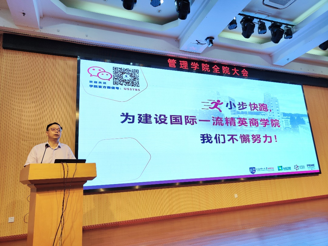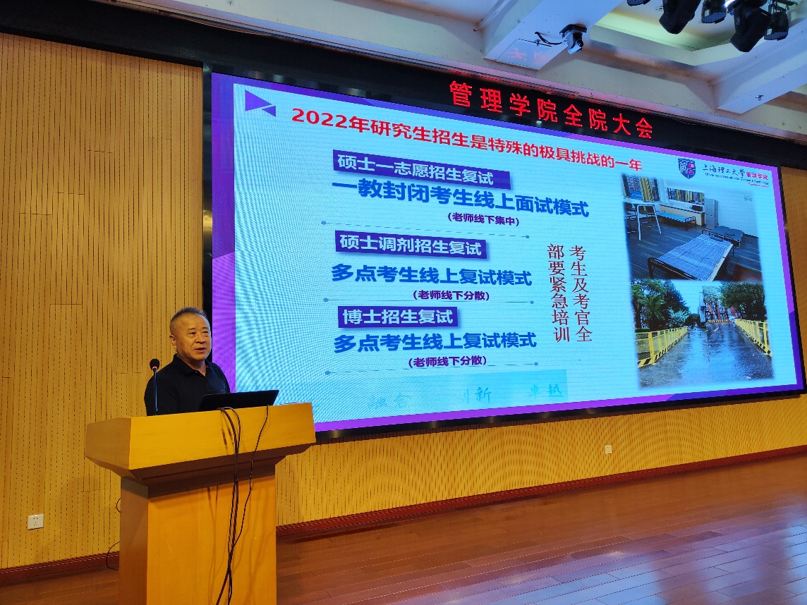 院长赵来军以“戮力同心抗疫情,小步快跑谱新篇”为主题从学院抗疫工作、师资队伍建设、学科学位点建设、专业学位教育中心和EDP中心工作四个方面进行了总结部署。首先,他回顾了上学期带领学院住校教师克服重重困难完成学校抗疫工作,希望大家能够争分夺秒把因疫情耽误的工作尽快赶上。其次,他介绍了今年人才引进的情况,虽然今年已入职教师国际化比例不断提升,但是入职率相比去年同期下降很多,疫情对人才引进工作的影响非常明显。除了学院要加大面试频次,加强宣传力度,他也希望每位教师能够积极荐才引才,只有更多的人才,学院才能有更多的高水平成果产出,才能更快得成为国际一流精英商学院。