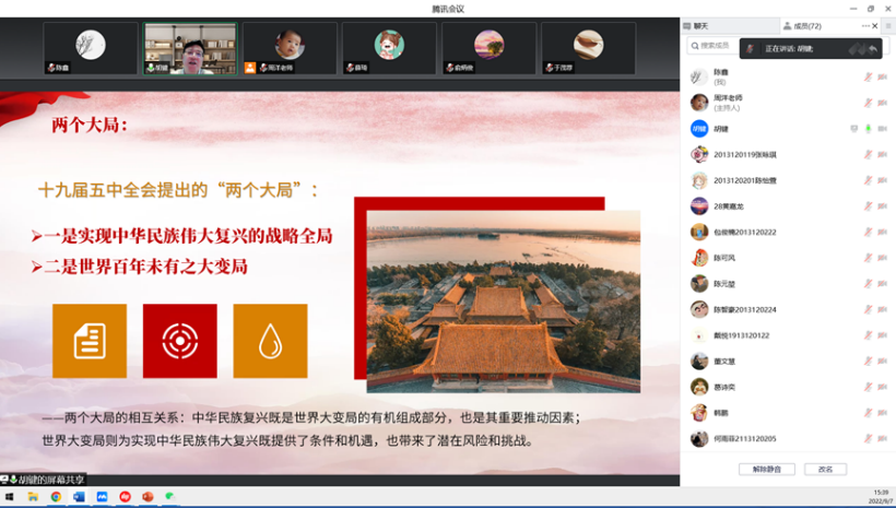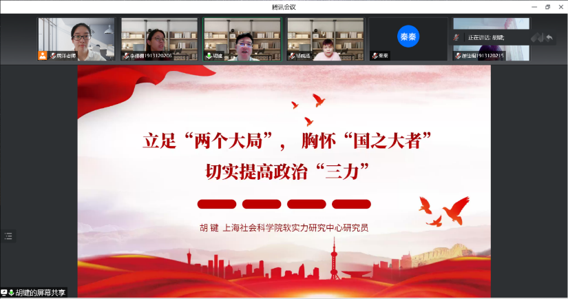 为迎接党的二十大胜利召开,全面提升课程思政教学改革质量和团队教学能力,在课程思政团队负责人、副院长何建佳以及副院长张峥的带领下,工商管理系于9月8日在线组织了“立足‘两个大局’,胸怀‘国之大者’”主题学习活动,持续强化教学团队的政治判断力、政治领悟力和政治执行力。本次会议由副系主任周洋主持,工商管理系师生齐聚线上,共同聆听了上海社会科学院软实力研究中心研究员、博士生导师胡键教授的主题报告。