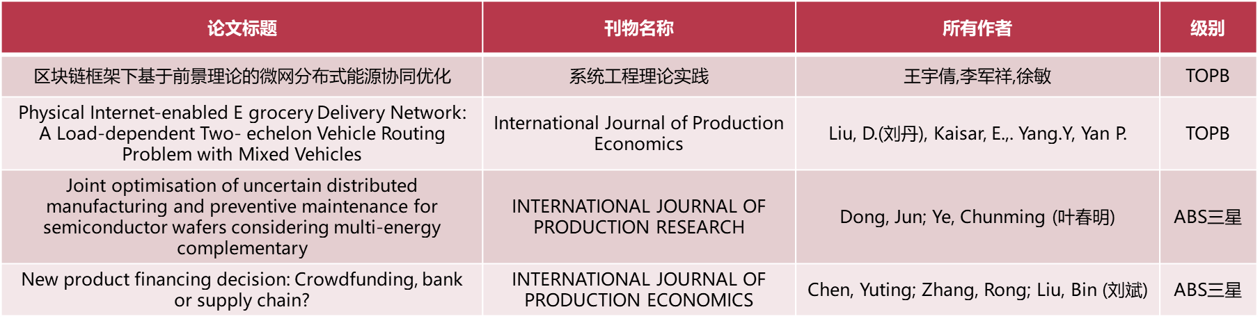 在论文成果方面,刘斌教授和刘丹副教授分别在ABS三星及TOPB期刊 International Journal of Production Economics(IJPE)发表了研究成果,刘斌教授在供应链融资领域、刘丹副教授在无人驾驶车辆运输网络优化方面都进行了深入探索。叶春明教授在ABS三星期刊International Journal of Production Research (IJPR)发表了半导体绿色调度方面的最新研究成果。李军祥教授在TOPB期刊《系统工程理论和实践》上发表了基于行为科学理论的微网调度方面的最新研究成果。四位教授均承担过国家自然科学基金并作为相关研究成果及时地总结发表。