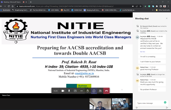 2022年9月17日下午,应我院邀请,印度国立工业工程学院(NITIE)Rakesh D.Raut教授就AACSB认证中的经验进行了线上分享和交流讨论。会议由我院印度籍教师Hareesh博士(何玄)主持,副院长何建佳、院长助理王峣鹏博士、国际化建设办公室主任仲伟冰老师,以及国际化建设办公室成员等参加了交流会。