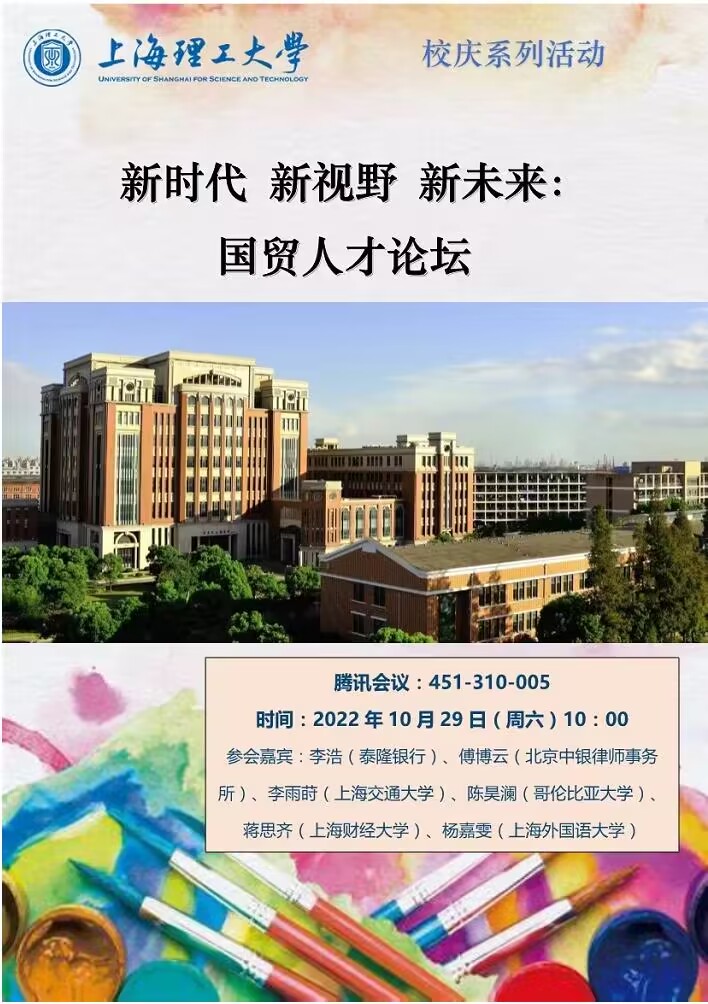2022年10月29日上午,为庆祝上海理工大学116周年华诞,积极响应学校、学院组织开展校庆系列活动的号召,主题为“新时代、新视野、新未来”的国际经济与贸易系人才论坛在线上顺利举行。国贸系主任罗芳,副主任秦炳涛,全体教师以及部分研究生和本科生参与此次活动。活动由国贸系党支部书记何文主持。
