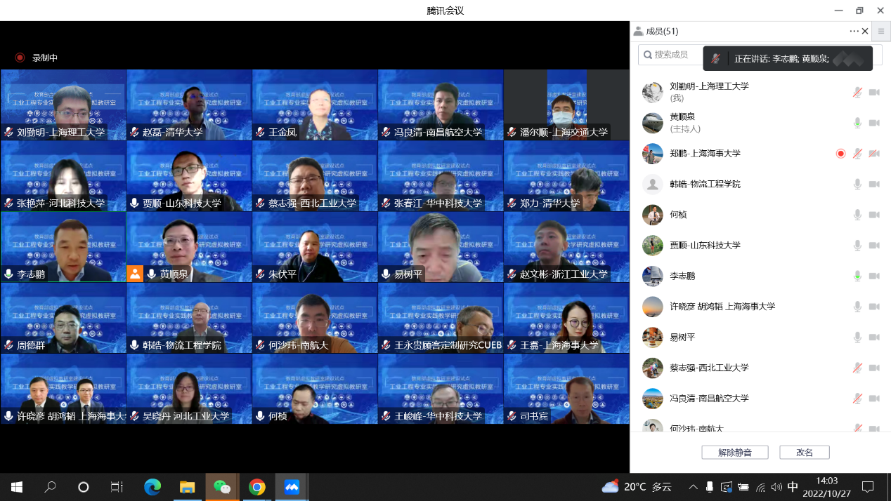 近日,工业工程教研室(专业)获批教育部工业工程专业实践教学研究虚拟教研室成员单位。为了深入贯彻落实教育部《关于加快推进虚拟教研室试点建设工作通知》的要求,2022年10月27日下午14:00-17:30,上海海事大学牵头,共25所合作院校联合举办了教育部《工业工程专业实践教学研究虚拟教研室》建设研讨会。工业工程专业刘斌教授和刘勤明副教授参加了此次会议。