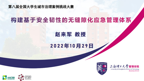 上海理工大学管理学院院长赵来军教授于2022年10月29日应邀为第八届全国大学生城市治理案例挑战大赛(2022)作了题为“构建基于安全韧性的无缝隙化应急管理体系”的主旨演讲。赵来军首先强调了应急管理体系和能力建设的必要性,指出目前我国自然灾害、事故灾难和社会安全等多种突发事件的风险交织叠加、易发多发,对城市公共安全威胁日益加重的现状。然后,他通过典型案例剖析,结合近年来完成的多项城市应急管理课题,具体分析了当前应急管理体系在事前监测预警、事中应对、事后恢复、多部门协同等方面存在的不足。最后,他指出提升我国应急管理体系的安全韧性,构建无缝隙化应急管理体系,是推进国家治理体系和治理能力现代化的重要组成,并从强化制度韧性、提升预警能力、加强应急储备、重视基层治理等多个方面,提出构建基于安全韧性的无缝隙化应急管理体系的策略,推动我国应急管理体系和能力建设。