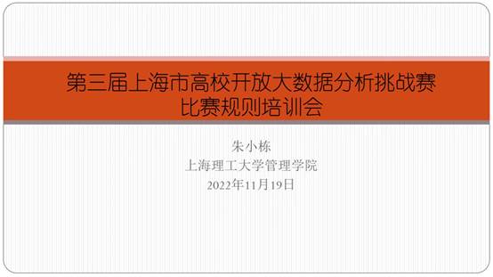 11月19日上午,信息管理与信息系统系举办了第三届上海市高校开放大数据分析挑战赛培训的线上讲座,来自长三角地区10余所高校的100余名师生参会。本届大赛的主题是“后疫情时代的民生和企业发展”,共有55支参赛队伍获得成功报名审核。大赛致力于提升当代大学生的数据分析与算法应用能力,同时从疫情本身演化规律、工业互联网、农业农产品、国际贸易、服务业和金融业6个方面设计选题,为后疫情时代的民生和企业发展出谋划策。会议由信息管理与信息系统系朱小栋副教授主持,会议内容具体分为两个部分:“基于蓝鹰新商科大数据实验室的比赛数据分析平台操作培训”和“比赛规则的培训”。