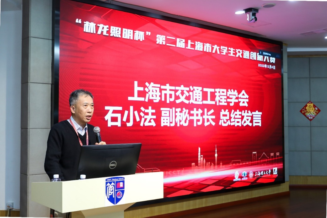 最后,上海市交通工程学会石小法副秘书长进行总结发言,他对本次参赛作品的水平给予了高度肯定,指出本次大赛充分响应了国家《“十四五”现代综合交通运输体系发展规划》提出的构建高质量综合立体交通网,加快智能技术深度推广应用,全面推进绿色低碳转型等战略目标,也充分展示了上海市交通运输相关专业大学生的创新能力与科研素养。最后,他代表主办单位宣布第二届年上海市大学生交通创新大赛圆满结束。