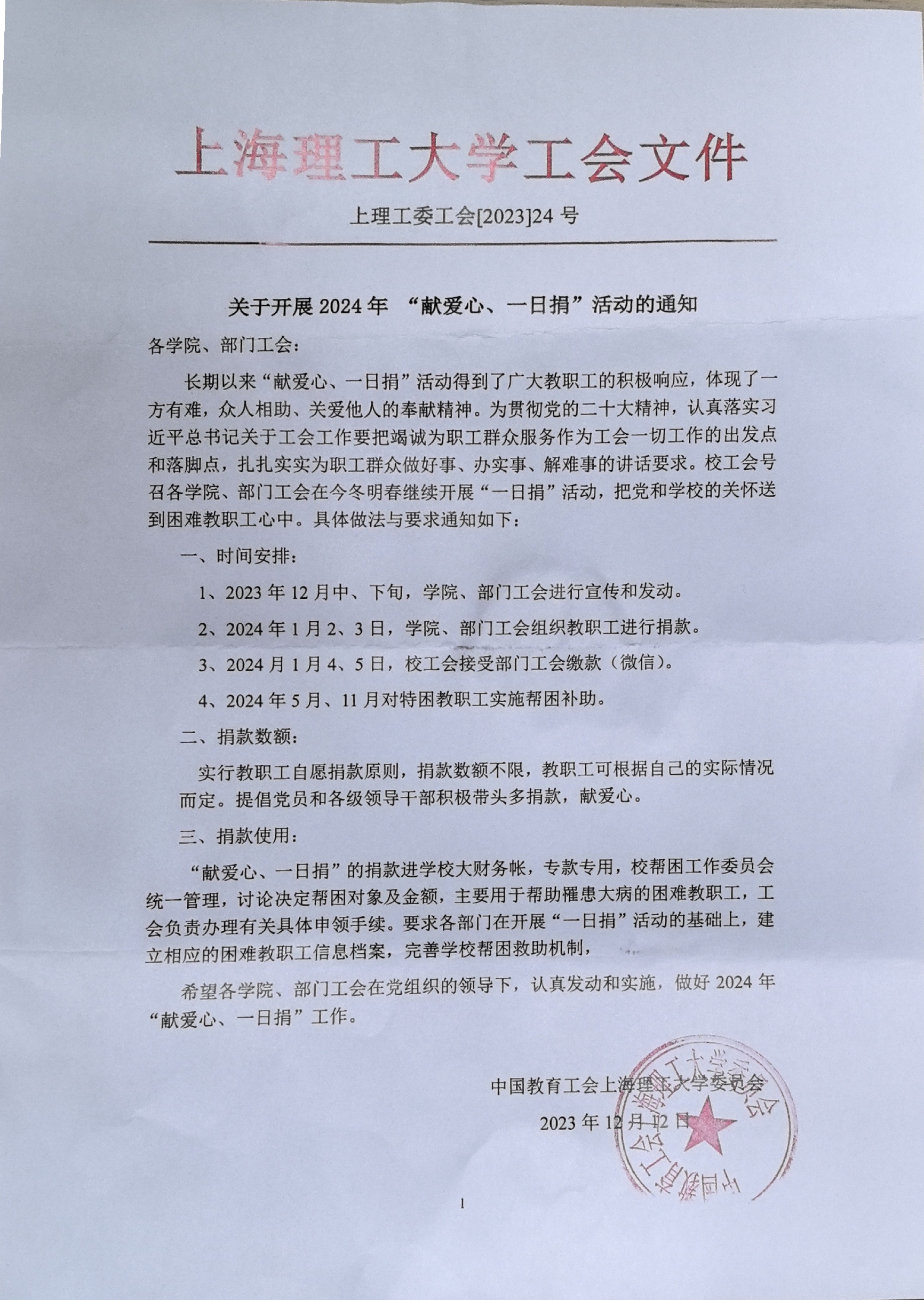关于认真开展2024 年“献爱心、一日捐”活动的通知