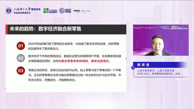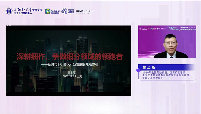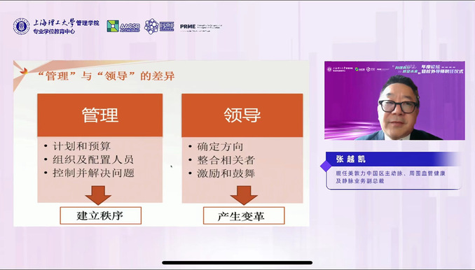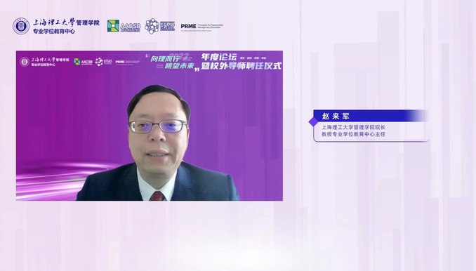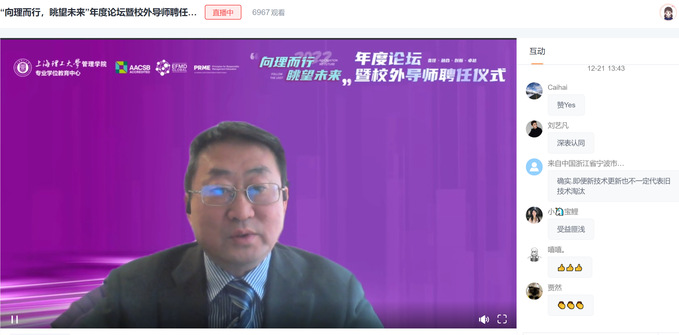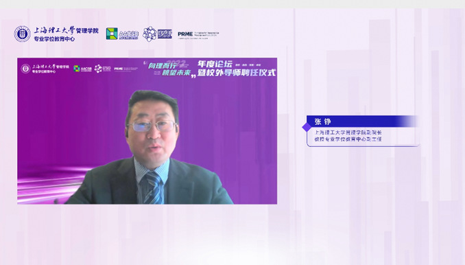 2022年12月21日,上海理工大学管理学院专业学位教育中心以线上形式成功举办“向理而行,眺望未来”年度论坛——暨校外导师聘任仪式。应邀参加本次年度论坛的嘉宾有美敦力中国区主动脉、周围血管健康及静脉业务副总裁张越凯,和尊营销集团董事长、总裁杨宗浩(上理优秀校友),上海沃迪智能装备股份有限公司副总经理童上高(上理2012级MBA杰出校友),睿问创始人兼CEO 邱玉梅(上理管院优秀校友),上海理工大学管理学院院长赵来军、副院长张峥、工商管理系主任葛玉辉、智慧工程研究中心主任樊重俊。论坛主要包括学术演讲和产业实践两个部分,同时从理论和实践角度进行探讨和交流,专业学位教育中心的师生线上参与了论坛活动。本次年度论坛由张峥主持。