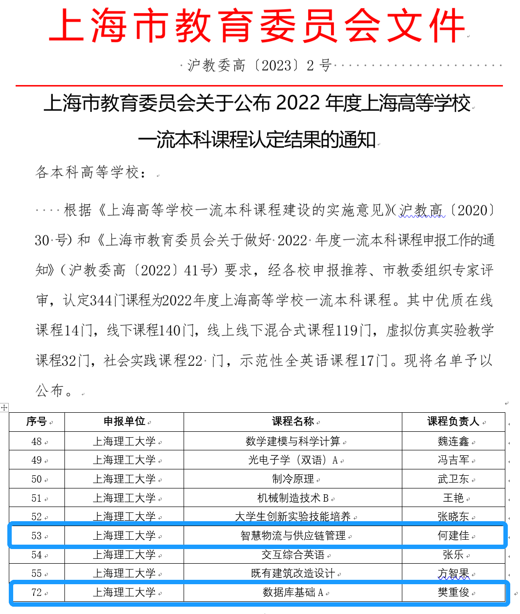 近日,上海市教委发布了《上海市教育委员会关于公布2022年度上海高等学校一流本科课程认定结果的通知》(沪教委高[2023]2号), 全校共有13门课程被认定为2022年度上海高等学校一流本科课程,其中我院有2门课程获得认定。截至目前,我院共有5门课程获得上海高等学校一流本科课程认定。
