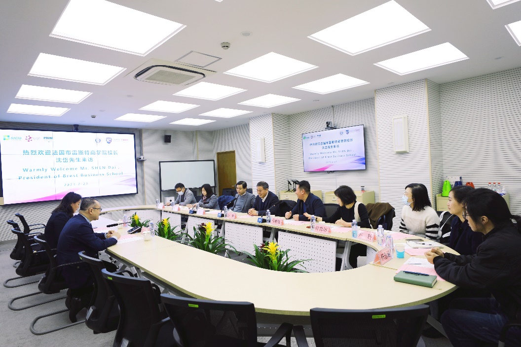 2月23日上午,法国布雷斯特商学院校长沈岱、法国Junia工程师学院中国首席代表廖晓燕来我校交流访问,洽谈国际教育交流与合作事宜。校党委副书记、副校长盛春,管理学院党委书记马静波,副院长何建佳与沈岱一行在管理学院506会议室举行会谈,校国际交流处、管理学院国际化建设办公室及管理学院教师代表参加会谈。会谈由马静波主持。