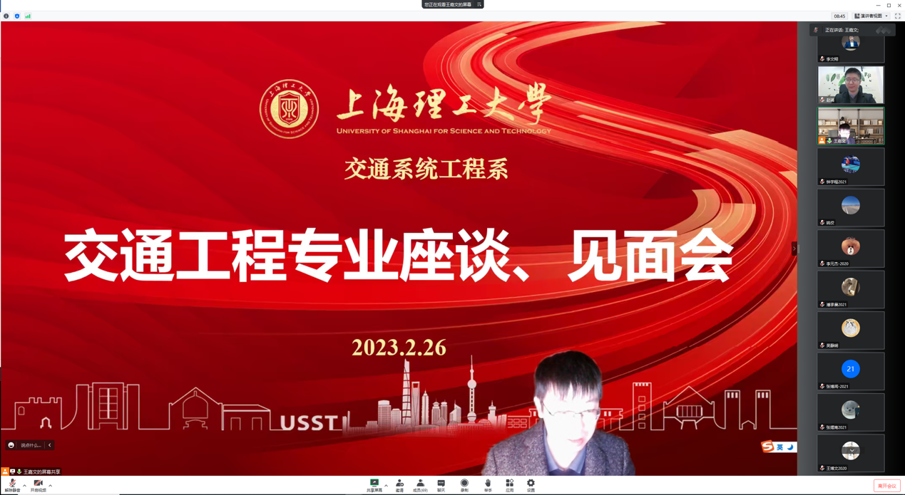 随后,开展了交通工程专业师生线上见面活动。各位参会教师逐一介绍自己的研究方向、所授课程,并针对性传授了学习与科创经验,为学生提供全方面的建议。该环节加强了学生与老师之间的联系,让学生更了解专业教师、学科特点。