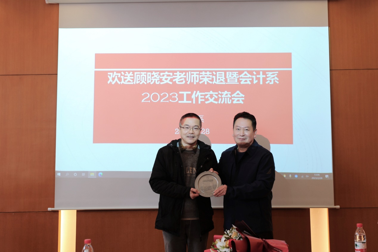 2023年2月28日下午,会计系在管理学院910会议室召开欢送顾晓安老师荣退暨会计系2023工作交流会。管理学院党委书记马静波及会计系的全体教师出席。系主任赵洪进教授主持会议。