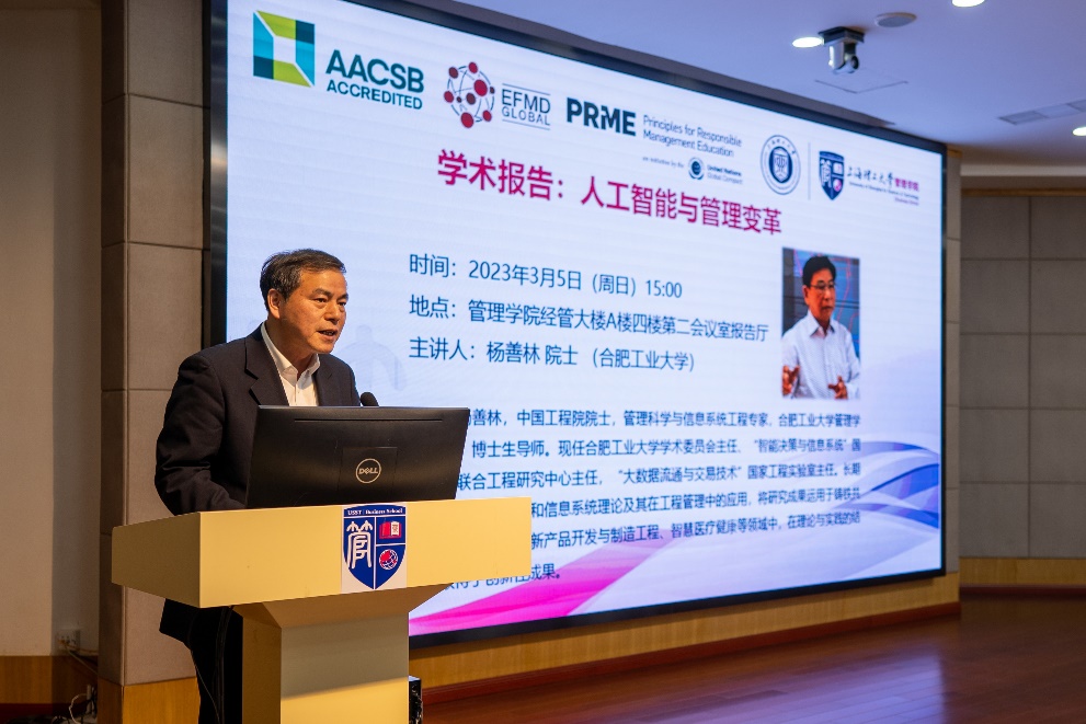 3月5日下午,杨善林院士应邀来校为师生作了题为“人工智能与管理变革”的学术报告。校党委副书记、副校长盛春,管理学院院长赵来军、院党委书记马静波、院党委副书记蒲莹莹出席报告会。来自全校100余名师生参加报告会。报告会由盛春主持。
