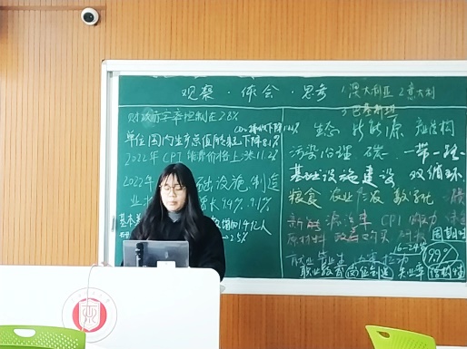 在第二个板块,同学们分组对关注的经济和社会领域展开思考与讨论,各组代表根据讨论结果进行发言。刘仁伟同学提出:“两山理论是我国高质量发展的指导思想,中国需要通过大力发展新能源产业实现经济绿色转型”;吕坤阳同学提出:“在基础设施建设稳步提升背景下,我国需要加强制造业和高技术产业投资,对新基建进行合理和系统布局”;周欣雨同学提出:“中国在保障粮食安全的前提下,未来仍需要提升农业现代化建设,推进产业融合提效增收和拓宽农民增收致富渠道”;章晓琪同学提出:“去年国内新能源汽车销售量同比增长93.4%,未来企业需要注重原材料研发和降低成本,政府需实施相关政策保障措施,进一步激发市场消费活力”;原瑞霞和邱莉莉同学提出:“目前我国高校毕业生规模已超千万,大学生就业形势更加严峻,为此我国宏观经济需保持一定增速以提供充足就业岗位,未来需不断深化劳动力市场改革,加大毕业生公共就业服务”。