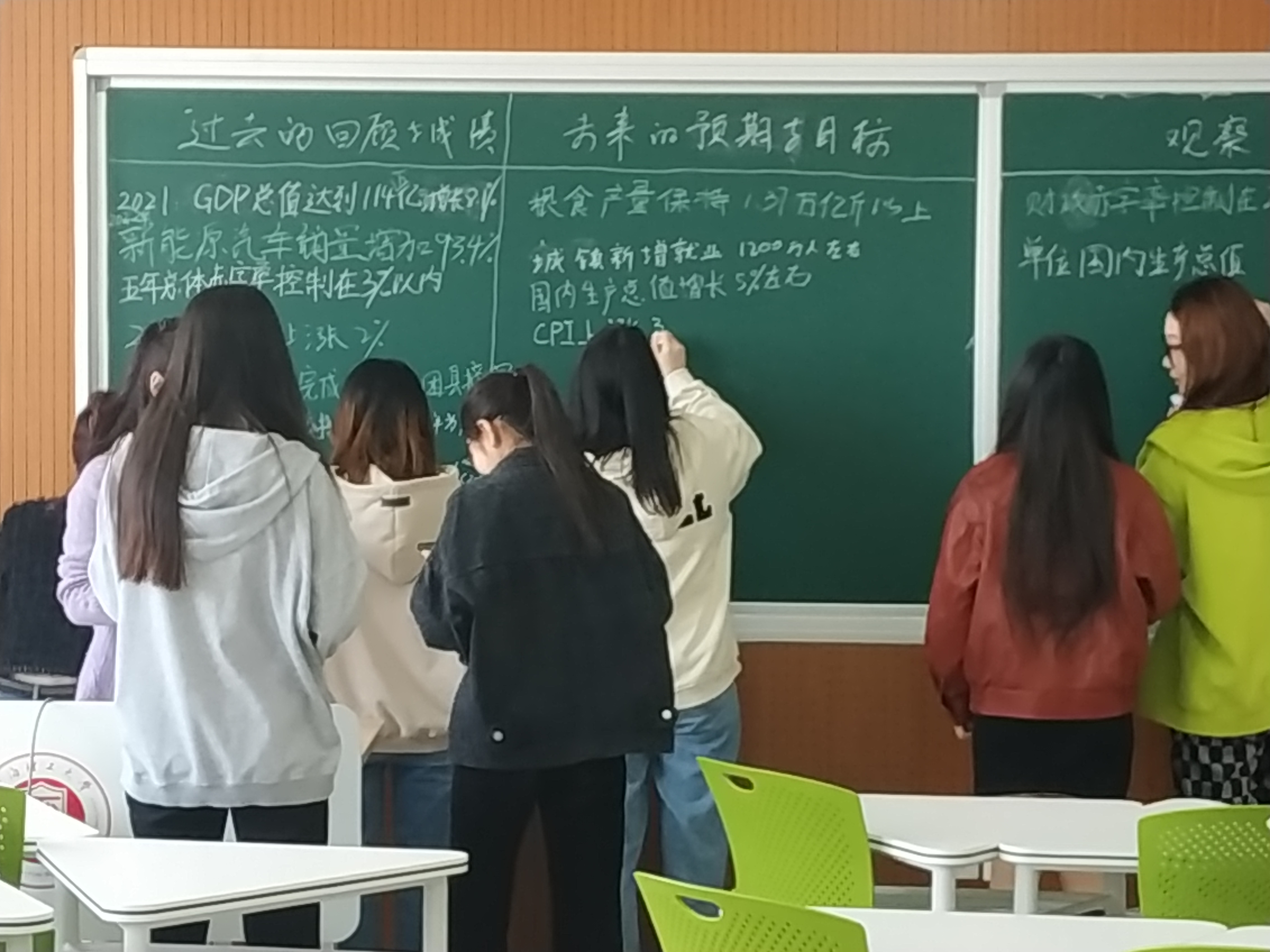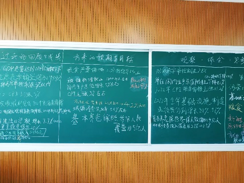 在第一个板块,同学们研读政府工作报告后,依次在黑板上的“过去的回顾与成绩”和“未来的预期与展望”栏中,写下了自己关注领域的宏观指标数据。主要集中在GDP增速、CPI、财政赤字率、宏观税负、进出口总额,粮食产量、就业率、养老保险参保率等方面。秦炳涛老师逐条与同学们进行了细致解读,梳理了各指标间的内在逻辑关系与相互影响,并对未来预期与目标做出详细分析。