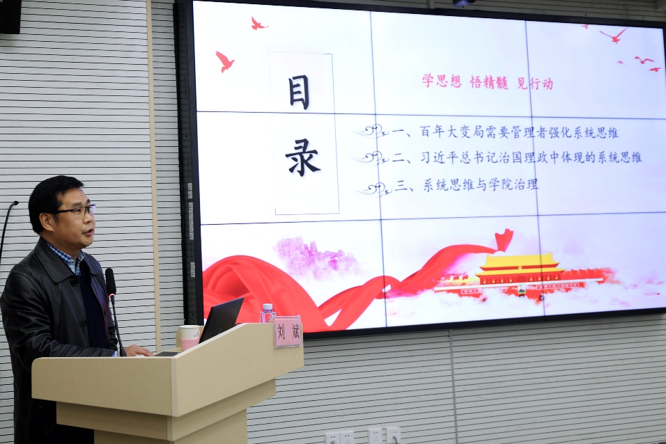 校二十大精神宣讲团成员、管理学院刘斌教授作“习近平总书记治国理政中体现的系统思维及其启示”报告。刘斌从“百年大变局需要管理者强化系统思维”“习近平总书记治国理政中体现的系统思维”“系统思维与学院治理”三个方面介绍了习近平总书记治国理政中所体现前瞻性思考、全局性谋划、整体性推进的系统思维及其启示。他指出,高等教育现代化是中国式现代化重要组成部分。实现高等教育现代化是一个复杂的系统工程,高校领导要心怀“国之大者”,把握高等教育发展大势、敢于担当、善于作为,书写高等教育现代化的上海理工大学新篇章。与会人员围绕深入学习贯彻党的二十大精神进行了深入学习交流。