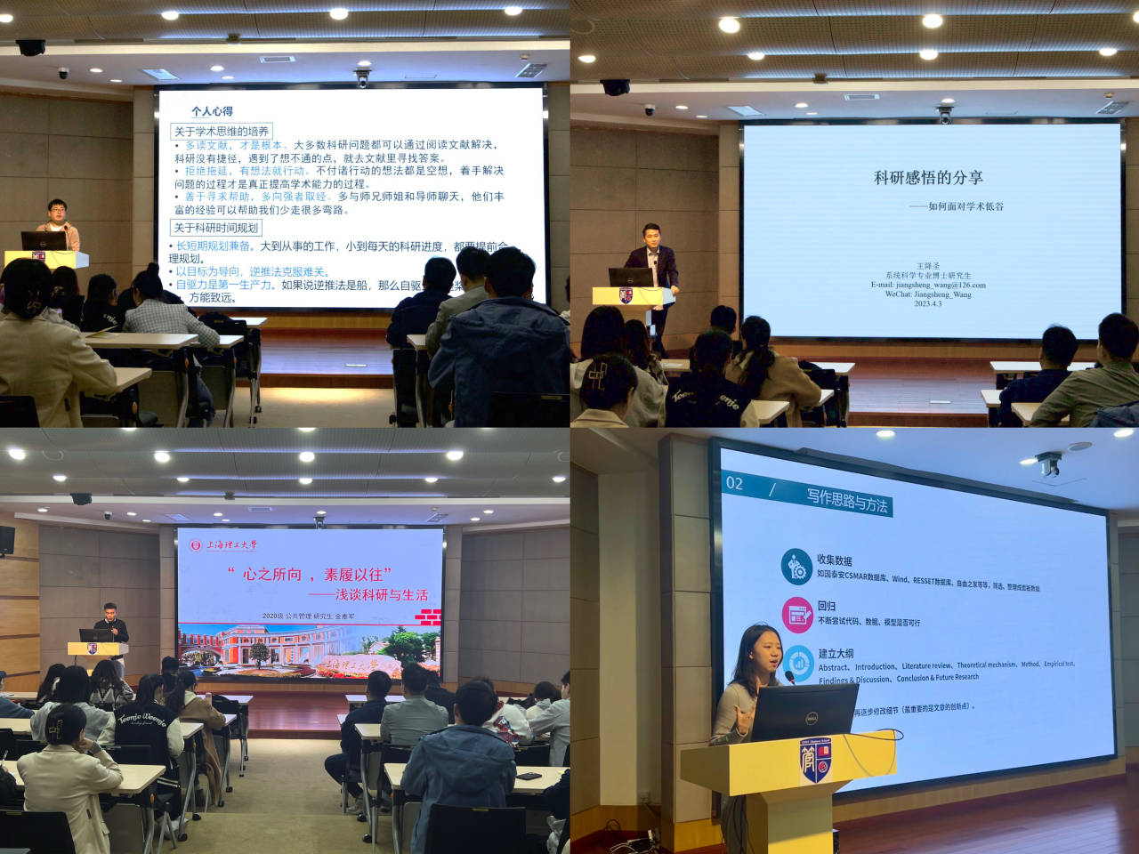2023年4月3日,“共话研途·筑梦前行”学术分享会在管理学院第二会议室举办。学术分享会邀请2021级系统科学专业博士屈德强、2022级系统科学专业博士王降圣、2020级公共管理专业硕士金雅军、2021级应用经济学专业硕士郭欣四位同学担任主讲嘉宾,来自应用经济、系统科学、公共管理和工商管理等100余名硕士研究生参加。