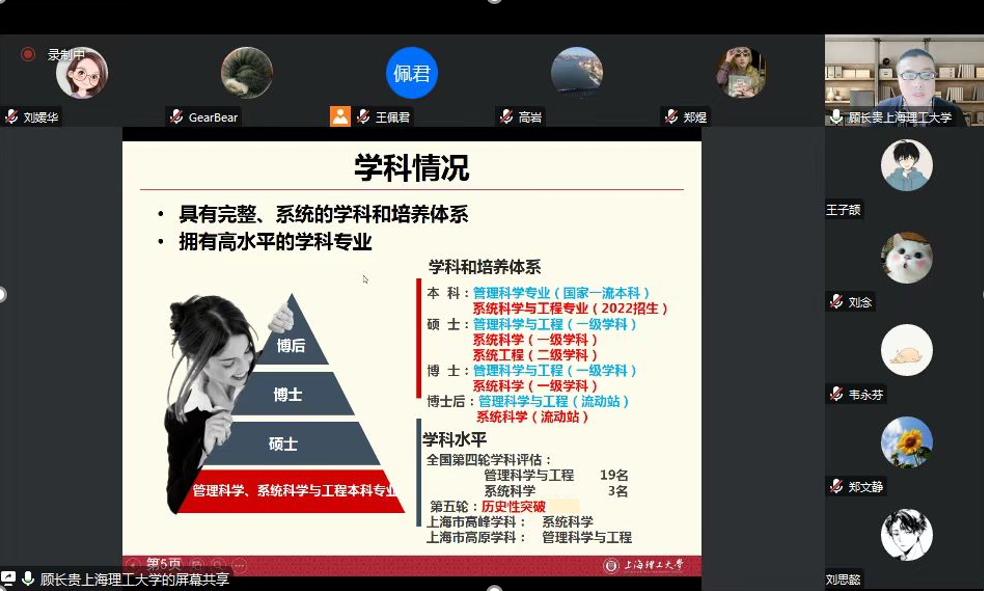 高岩深入浅出地阐述了上海理工大学系统科学学科创建过程与发展历程,并从学科机构设置、主要研究方向、研究生培养等多方面介绍了学科的学术影响力、未来发展以及人才培养方案。随后,顾长贵从历史沿革、学科情况、师资队伍、优秀毕业生等多方面对系统科学学科进行了具体的介绍,讲述了系统科学学科由名家开拓、继往开来的光辉历史,分享了学科在第五轮学科评估中的可喜成绩,强调了系统科学专业毕业生在就业市场的领先优势,介绍了包括本硕博连读、硕博连读等在内的灵活多样的科研人才孵化途径。