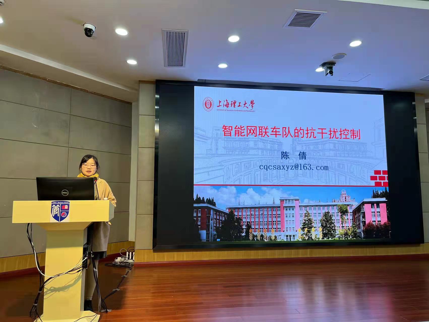 4月12日,沪江经管论坛系列活动(第48期)之青年学术沙龙在管理学院四楼第二会议室报告厅顺利举行。交通系统工程系青年教师陈倩作题为“智能网联车队抗干扰控制”的学术报告。报告会由国际经济与贸易系青年教师林敢主持,交通系统工程系部分教师以及管理学院研究生参加了此次报告。