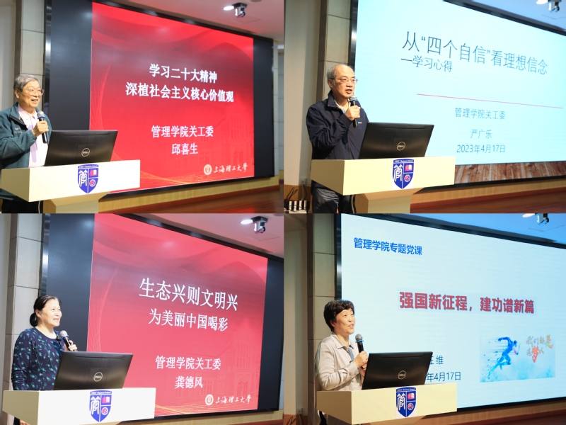 首先,四位老党员同志分别以《学习党的二十大精神 深植社会主义核心价值观》《从“四个自信”看理想信念》《生态兴则文明兴—为美丽中国喝彩》《强国新征程 建功谱新篇》为主题,通过系统的理论知识、详实的数据和经典案例,有重点地对于党的二十大精神进行了精彩的解读和分享,内容深入浅出,内涵丰富。