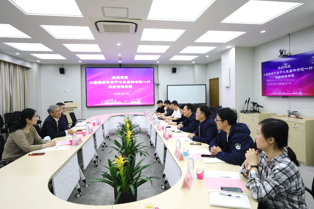 4月17日下午,上海超级计算中心党总支书记朱春林、人力资源部部长李力静、人工智能与大数据部副部长郭培卿一行到访管理学院。管理学院党委书记马静波接待朱春林一行,并举行座谈交流。信息管理与信息系统系党支部书记、电子商务发展研究院副院长朱小栋,党委专职组织员王瞿建以及信息管理与信息系统系教师代表出席座谈会。会议由朱小栋主持。