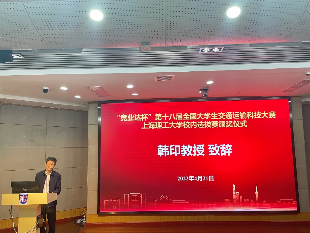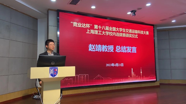 首先,韩印在致辞中鼓励并表扬了参加交通运输科技大赛的上理交通学子,指出比赛收获的不仅仅是荣誉,还有珍贵的团队友情,并提醒同学们在学习之余要积极锻炼,保持身心健康。之后,进入了颁奖环节。王嘉文为二等奖团队颁奖,姚佼与刘魏巍共同为一等奖团队颁奖,韩印与赵靖共同为特等奖团队颁奖。随后,赵靖做总结发言,提醒大家珍惜在大学的学习时光,并指出参赛小组即将进入与全国、全球人才同台竞争的状态,要奋发图强、努力完善各自的作品。
