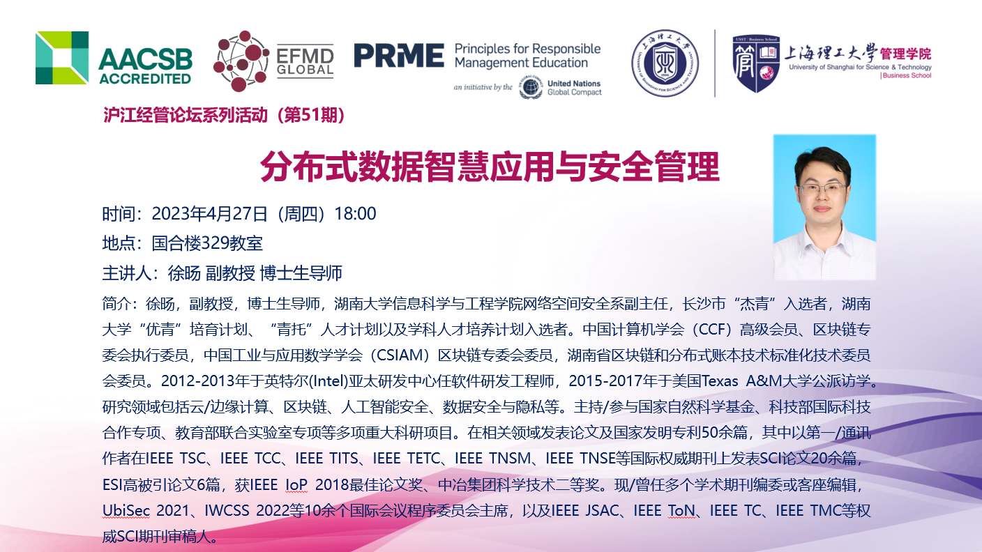 沪江经管论坛系列活动(第51期):分布式数据智慧应用与安全管理