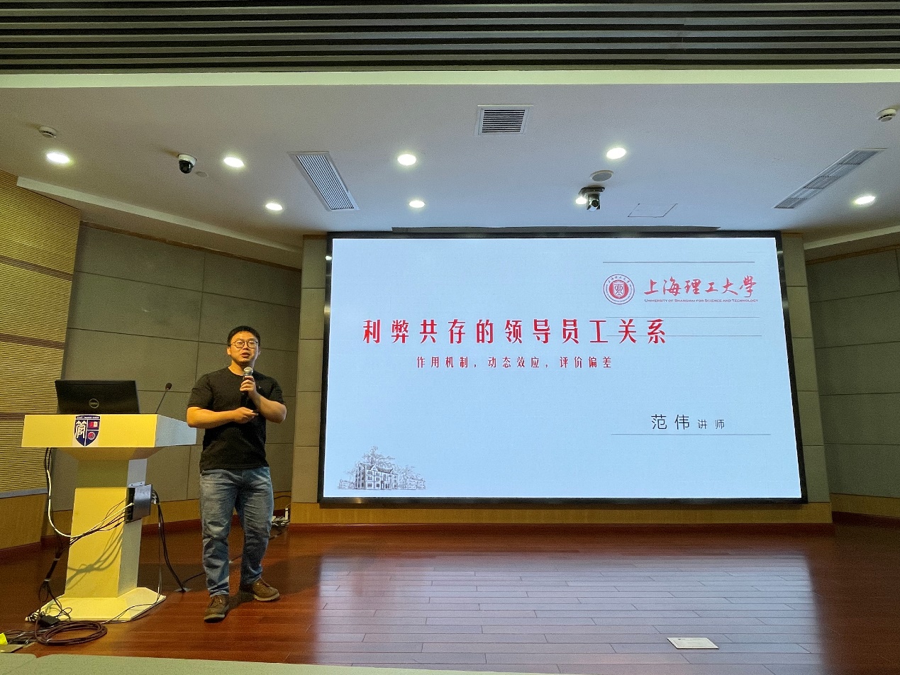 5月10日,沪江经管论坛系列活动(第54期)之青年学术沙龙在管理学院四楼第二会议室报告厅顺利举行。公共管理系青年教师范伟作题为“利弊共存的领导员工关系:作用机制,动态效应,评价偏差”的学术报告。报告由公共管理系青年教师刘心雨主持,管理学院部分师生参加了此次报告。
