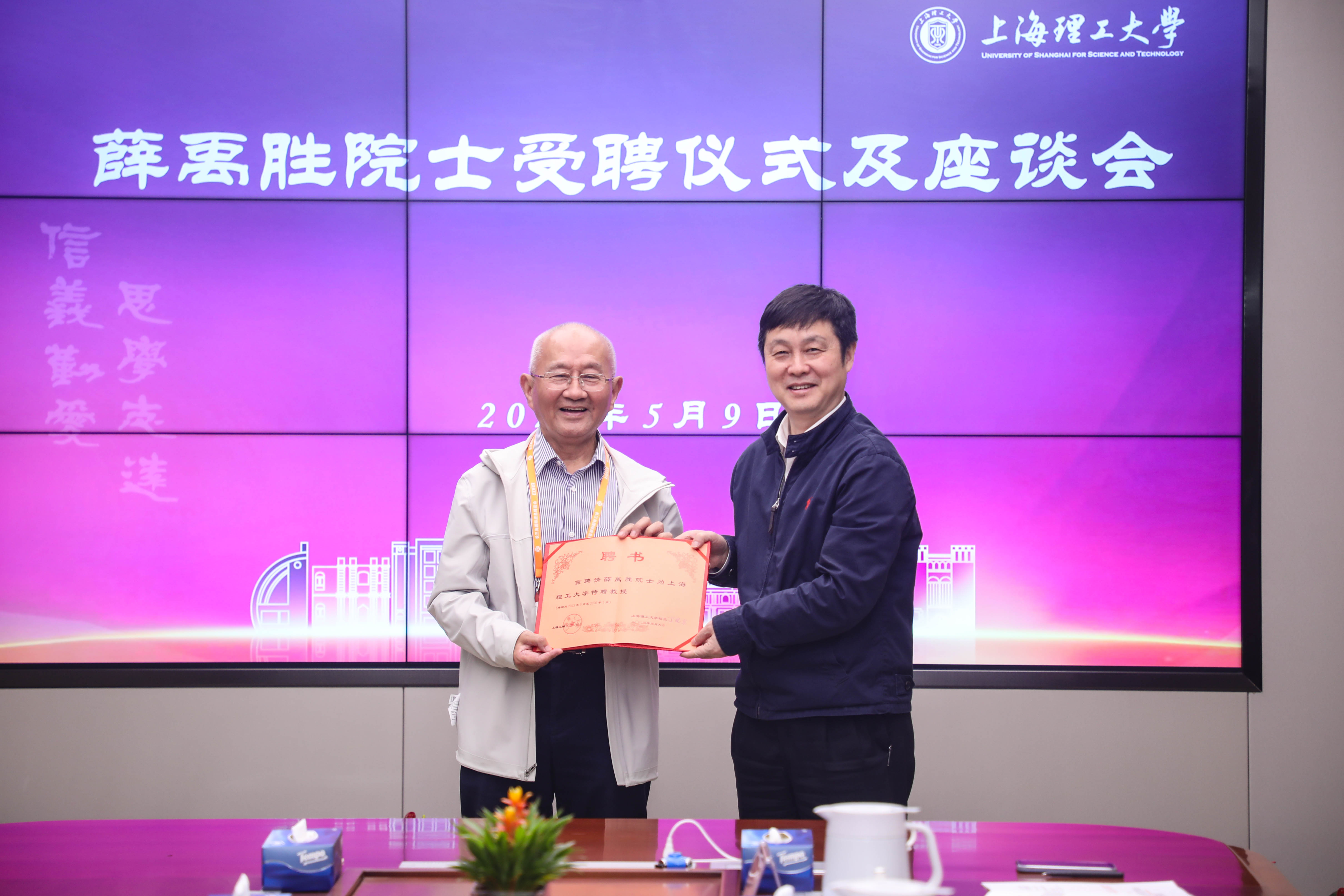 丁晓东代表学校向薛禹胜院士颁发聘书。薛禹胜院士对上海理工大学的聘任表示衷心感谢,他提到,上海理工大学历史悠久,学科特色显著,此次受聘为上海理工大学特聘教授,深感荣幸的同时也感到所肩负的责任,将尽自己所能支持、推动学校的发展,定将与学校师生共同瞄定学科前沿,做出成绩,为学校科学研究、人才培养等方面贡献力量。