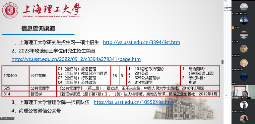 接着,李雅楠主要介绍了公管专业毕业生的就业、招生情况,以及研究生培养阶段的评奖评优相关规定,最后对近期启动的2023年暑期夏令营做动员和宣传,邀请同学们积极参与,欢迎同学们到上海理工大学管理学院感受上理文化和学术魅力。
