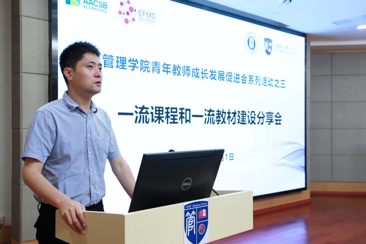 6月1日下午,管理学院青年教师成长发展促进会(以下简称:青促会)在经管大楼A楼四楼报告厅组织召开了青年教师一流课程和一流教材建设分享会。上海理工大学教务处副处长章国庆教授和管理学院叶春明教授主讲,管理学院副院长赵靖教授、青促会指导教师李正明教授以及管理学院全体青年教师参加了本次经验分享会。会议由管理学院青促会会长刘勤明主持。