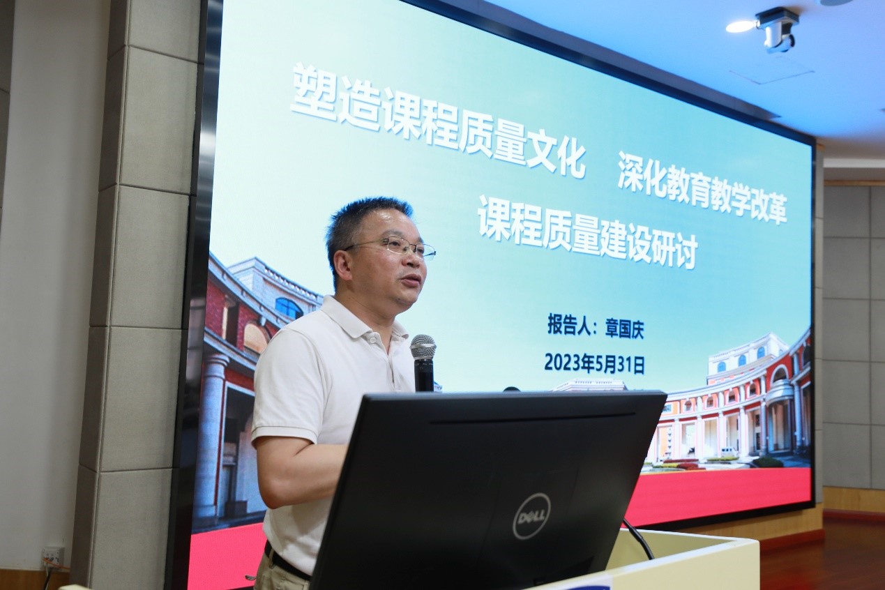 随后,章国庆以《立足学校人才培养目标,全面推进本科课程高质量发展》为主题,分享了当前学校一流课程和一流教材的总体情况、本科课程高质量发展要点、保障机制以及相关的工作任务安排。重点对课程质量文化建设、大思政课程建设、课程体系优化、教学方式改革、实践课程建设、完善课程考核体系以及课程教学团队建设七个方面进行了细致讲解。