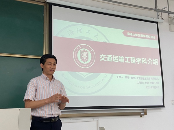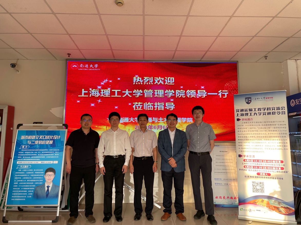 上海理工大学交通运输工程学科带头人韩印于6月6日率队前往南通大学交通与土木工程学院进行交流。管理学院副院长赵靖,交通系统工程系主任刘魏巍,支部书记姚佼,系副主任王嘉文一行参与了此次活动。韩印一行在南通大学举办了上海理工大学交通夏令营宣讲,为我校交通运输工程研究生招生做充分的宣传,同时也探讨了交通领域的最新研究进展并加强两校之间的合作。南通大学副校长兼交通与土木学院院长施佺、交通与土木工程学院书记张莉莉、副书记陈妍、副院长邵叶秦、副院长陈敏、智能交通系统系主任高锐锋和学院教师代表参与了此次活动。