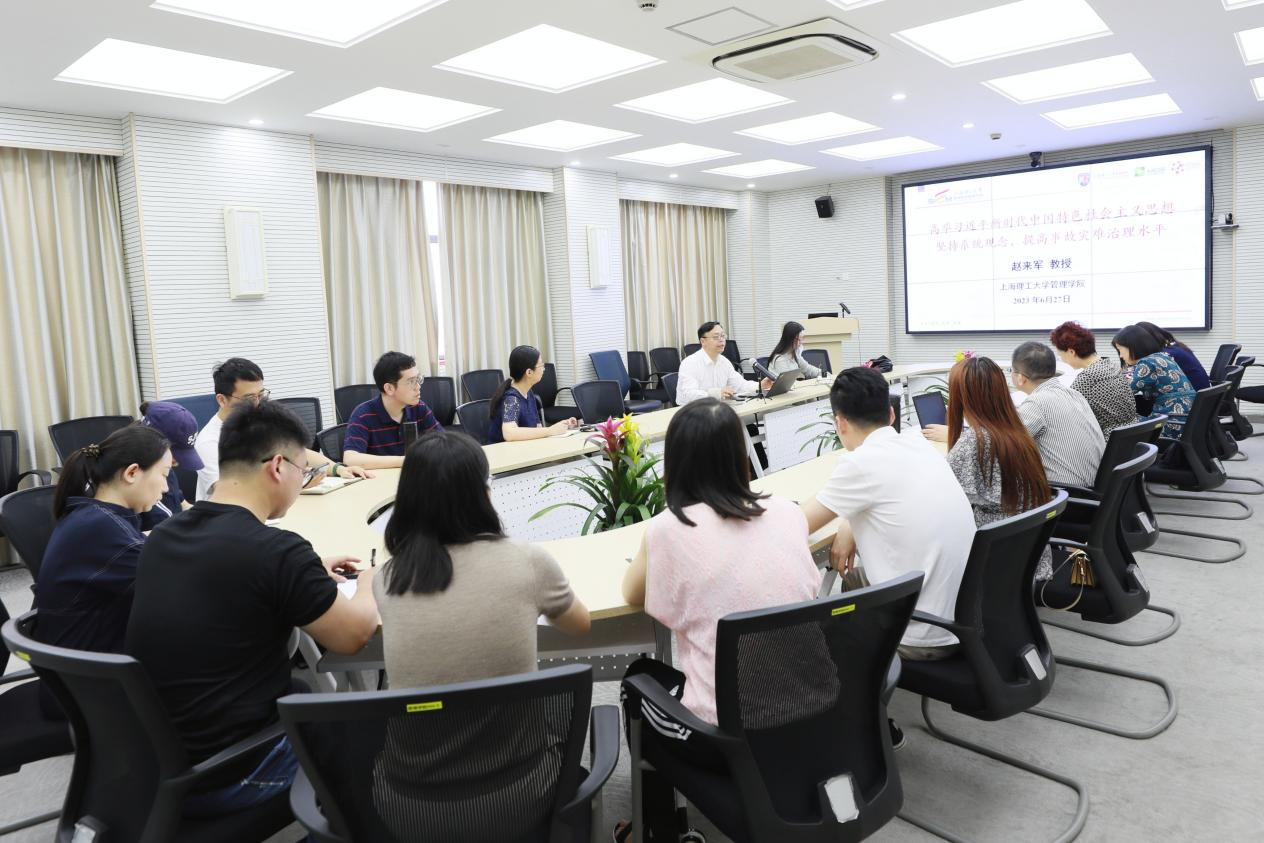 为深入贯彻党的二十大报告中“提高公共安全治理水平,完善社会治理体系”重要指示精神,公共管理系近日在经管大楼A楼506会议室开展主题教育专题党课,本次党课邀请管理学院院长、院党委副书记赵来军教授作题为《高举习近平新时代中国特色社会主义思想,坚持系统观念,提高事故灾难治理水平》的专题党课。公共管理系党支部成员,以及系统科学系部分教师参与此次专题党课。