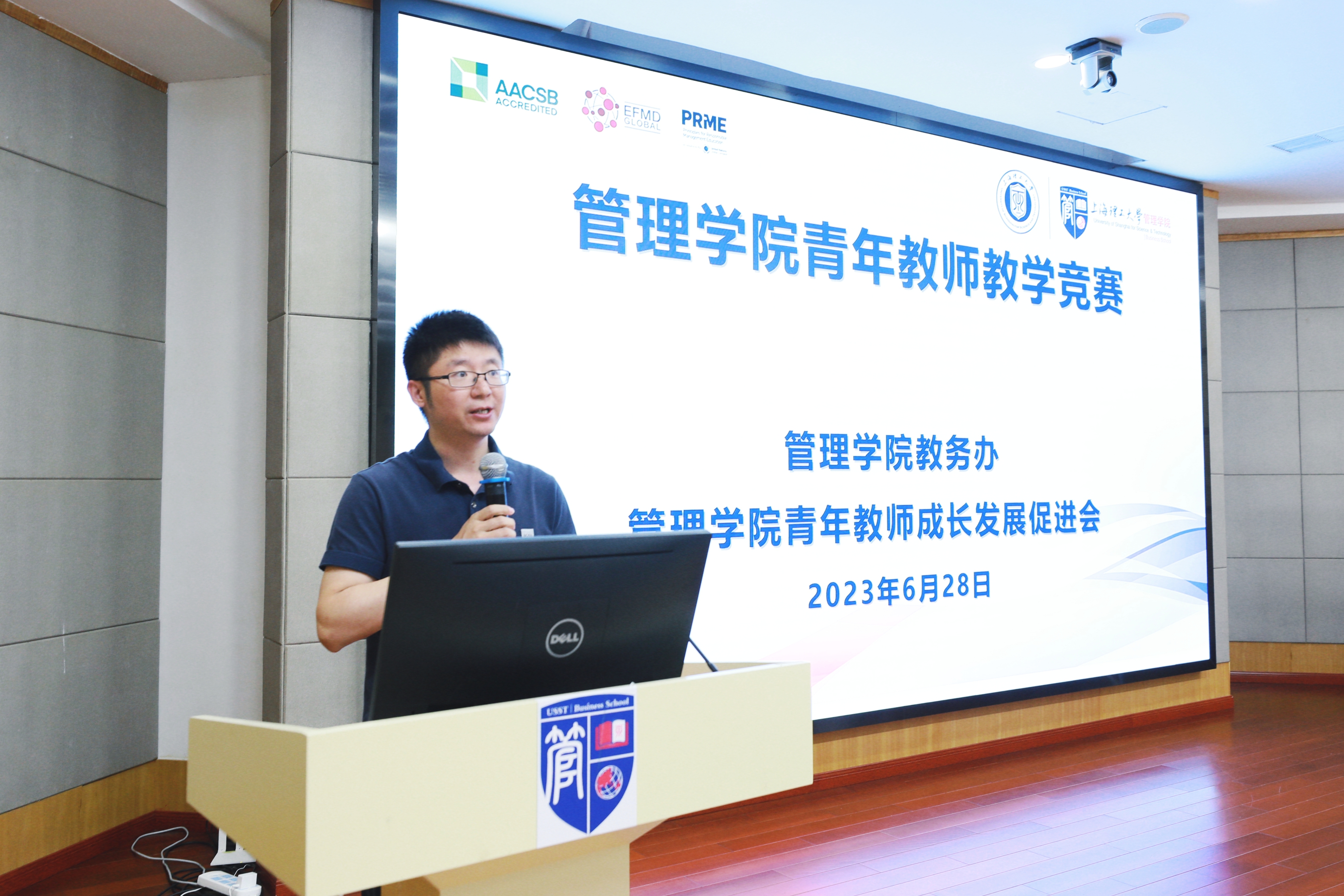 6月28日,管理学院青年教师教学竞赛暨青年教师成长发展促进会教学观摩研讨活动在经管大楼A楼四楼报告厅举行,学校教师发展中心主任、教师工作部副部长童元伟,管理学院李正明教授和上海市教学名师、理学院顾铮先教授担任大赛评委,管理学院副院长赵靖教授、青促会会长刘勤明教授以及管理学院青年教师参加,会议由刘勤明主持。