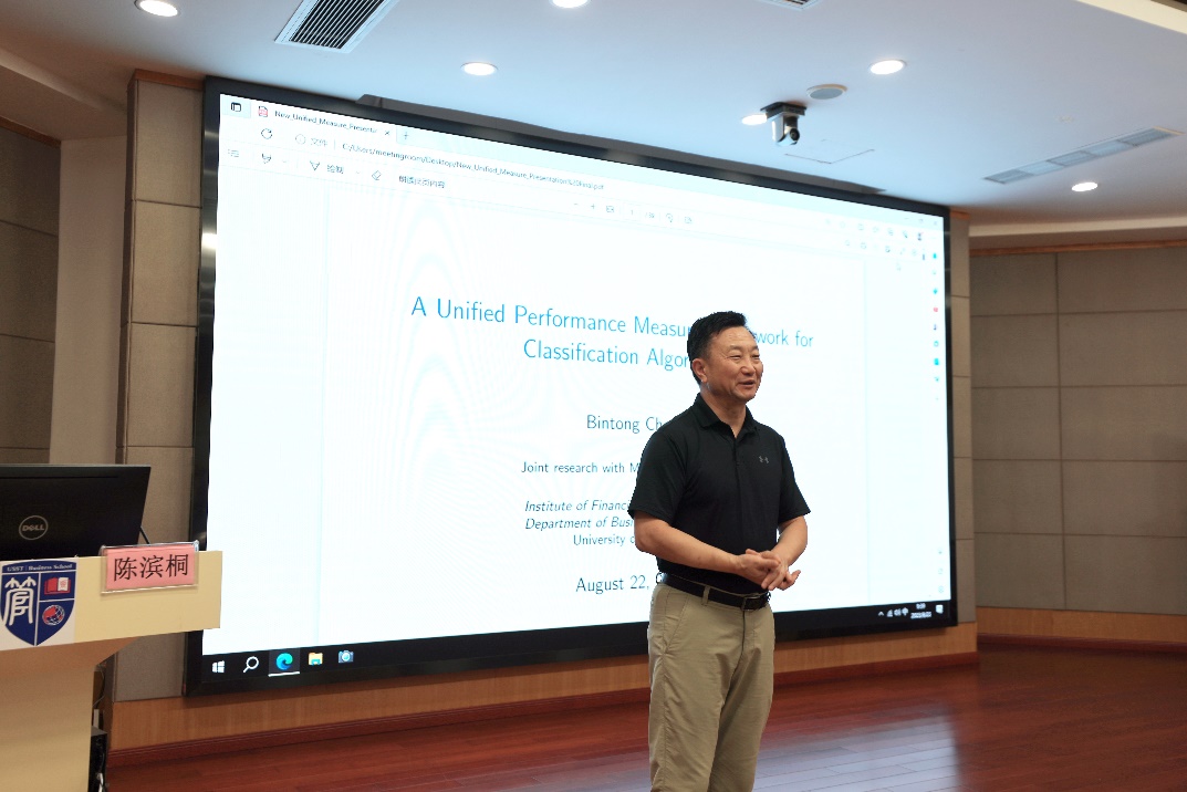 8月23日上午,我院发展战略咨询委员会委员、特拉华大学勒纳商学与经济学院陈滨桐教授应邀来我院开展学术交流活动,并以“一种针对分类算法的统一性能度量框架”为题作学术报告。本次报告由管理学院院长赵来军教授主持,副院长何建佳教授、学院相关学科教师及研究生参加了本次讲座。