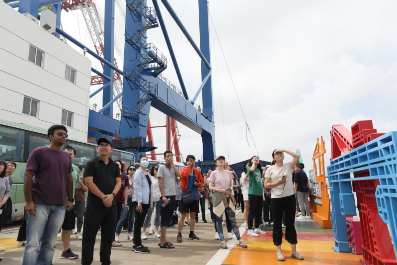 排开,南工业北生态的整体格局一览无余。在0号码头,大家仰望大型化岸桥,近距离参观大型起重机箱梁智能制造车间、大梁内部机器人焊接工作站、环保观测站,接触了万吨级整机运输船和其他特种设备、船只等。