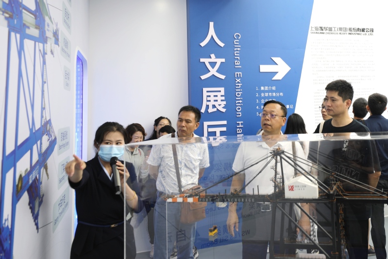 排开,南工业北生态的整体格局一览无余。在0号码头,大家仰望大型化岸桥,近距离参观大型起重机箱梁智能制造车间、大梁内部机器人焊接工作站、环保观测站,接触了万吨级整机运输船和其他特种设备、船只等。