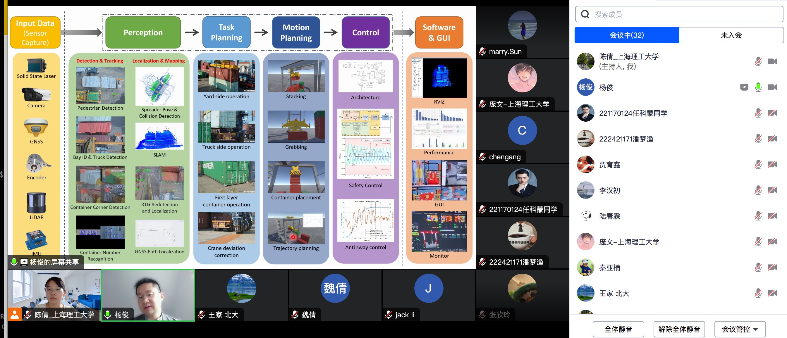 报告会上,杨俊首先介绍了RTG桥式起重机系统的全自动安全控制体系结构,并从智能感知、任务规划、运动规划和控制等多角度阐述了RTG桥式起重机的控制框架,对工程实际中涉及到的防摇控制、自适应控制以及安全控制等方面的问题予以剖析。最后,结合自动化港口场景下的实验测试效果,杨俊运用视频的方式向全体师生清晰展现了RTG桥式起重机作业过程中存在的工程问题。