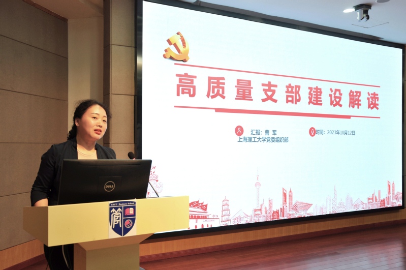 曹军首先对学校高质量支部建设做了全方位的解读,她从上海市党支部建设相关政策背景,支部规范化建设,如何写好工作案例三个方面进行展开,她认为加强党组织标准化、规范化建设是推动基层党建工作的有力举措,并提出党支部书记需要做好的七项工作:思想政治教育、规范组织生活、发展党员、党员管理、纪律处分、联系服务群众、加强班子建设。在党建工作案例材料的撰写和申报上,她指出首先要注意讲政治讲纪律的大方向。要熟悉党内基本法规,经常性学习理解新修订上位法或最新会议文件精神和相关要求。案例材料建议要准确呈现相关政策依据,材料体现的精神和原则不能和上级精神相悖,在了解政策大方向的基础上,立足本支部工作基础和特点,整理发展计划、凝练特色,根据特色再结合政策,确定材料的思路整理方向。