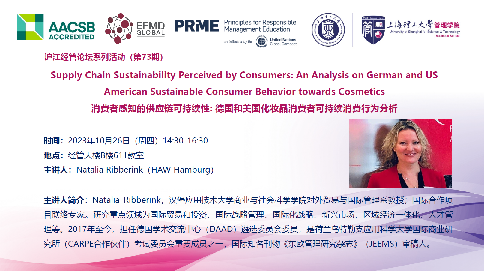 沪江经管论坛系列活动(第73期):Supply Chain Sustainability Perceived by Consumers: An Analysis on German and US American Sustainable Consumer Behavior towards Cosmetics