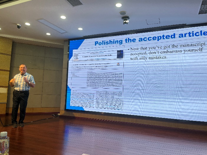 本次“如何发表高质量学术论文”讲座由我院管理科学与工程学科带头人马良教授、学科秘书智路平、赵敬华组织,得到了众多领导、老师、同学的共同关注。管理学院副院长赵靖教授致辞。讲座期间,Jim教授围绕期刊论文投稿流程、如何与编辑沟通以及投稿过程中遇到的和投稿说明、应答文件、论文修改以及论文录用后如何润色等相关问题进行了详尽讲述。最后,Jim用了大量幽默而写实的案例告诉同学们,不要害怕失败,失败是成功之母,努力的终点是辉煌。最后,同学们现场提问的有关论文投稿的问题,Jim教授均一一做了耐心回答。
