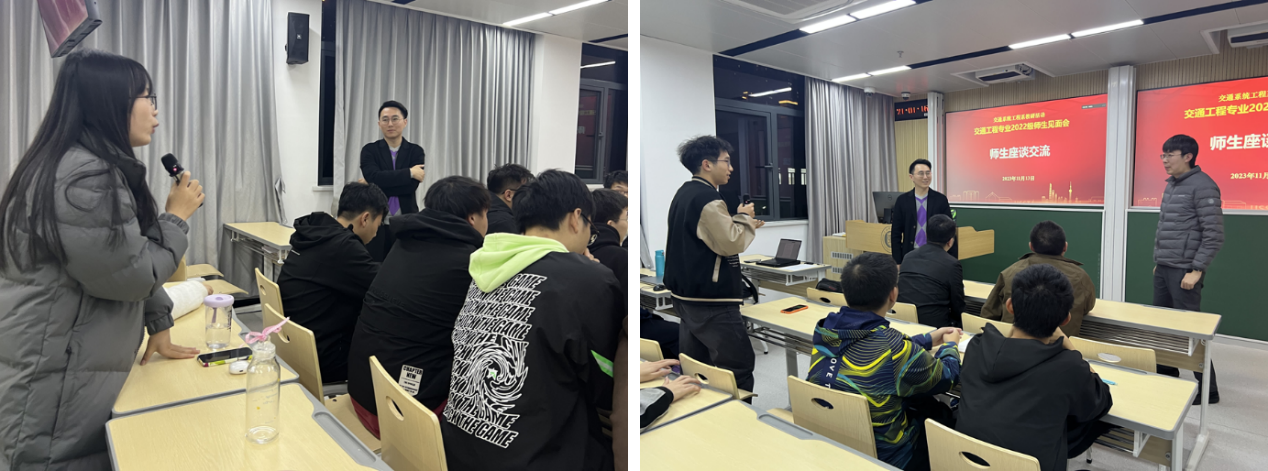 接着,参会教师代表依次介绍了各自的个人教育背景、研究方向和学术特色,旨在让学生们更全面地了解每位教师在专业领域的专长和研究重点,其中涵盖了道路与机场工程、交通控制与管理、智能交通控制、低碳交通规划、交通安全等多个领域。